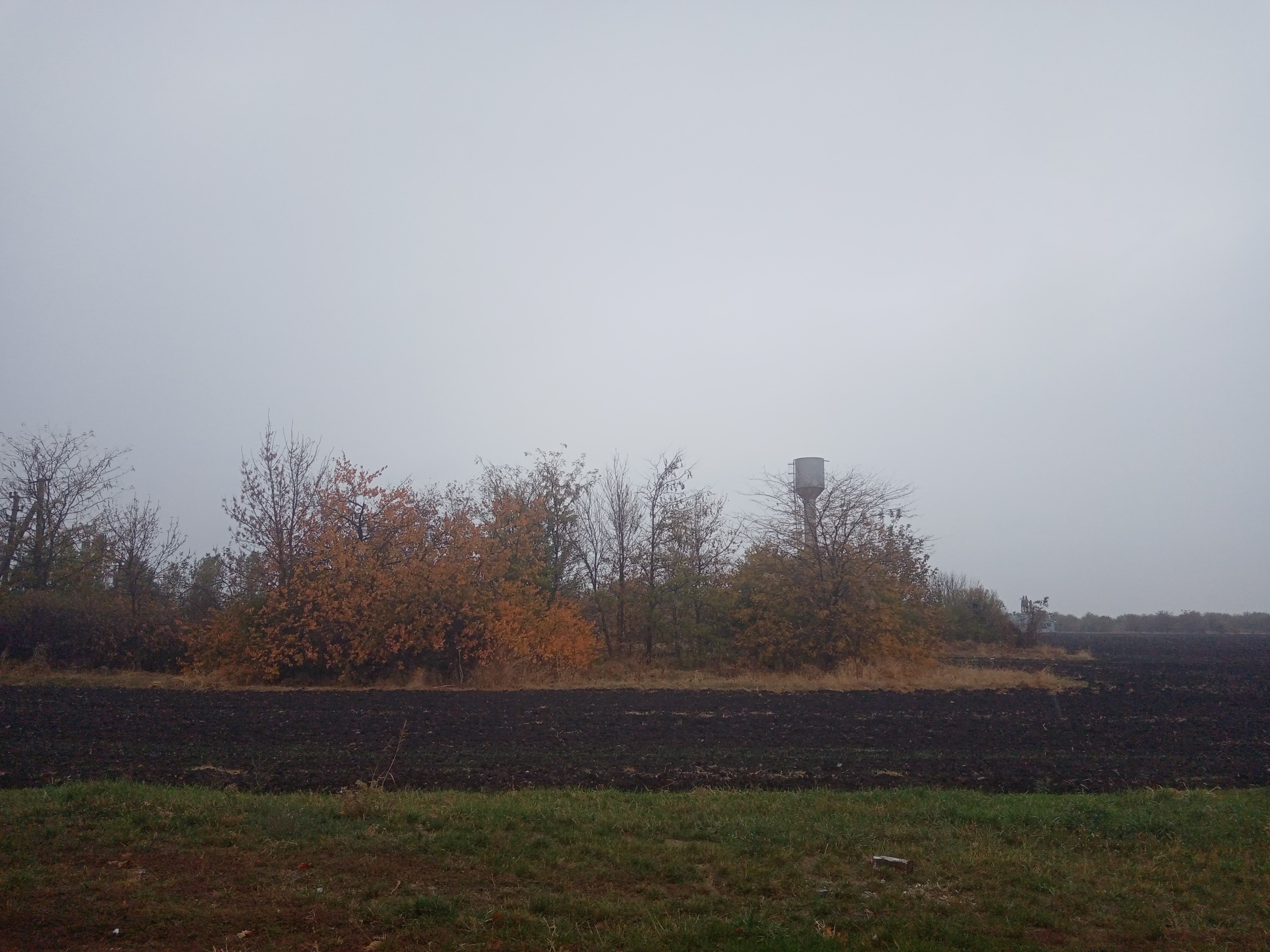 ¡Árboles brillantes de otoño contra un cielo gris y un campo arado!