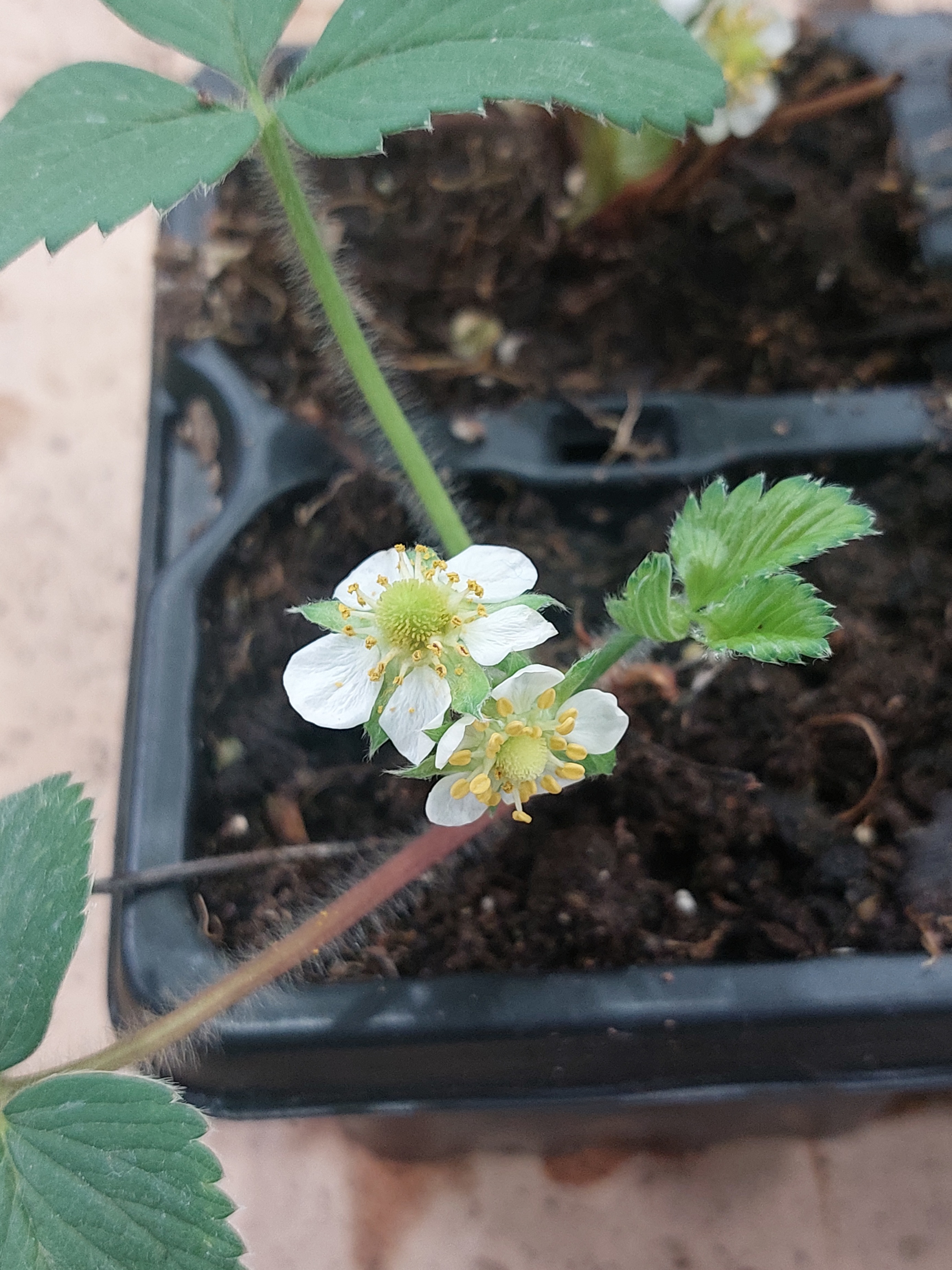 Plántulas y flores de fresa