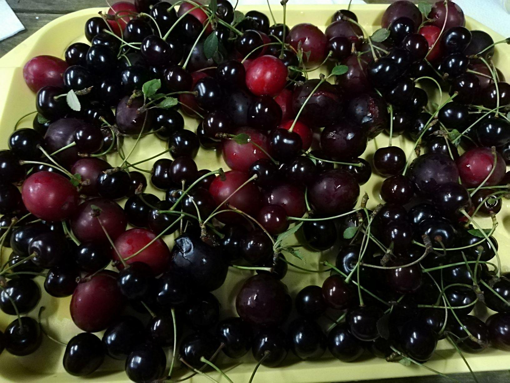 Deliciosas cerezas dulces en el campamento por la tarde