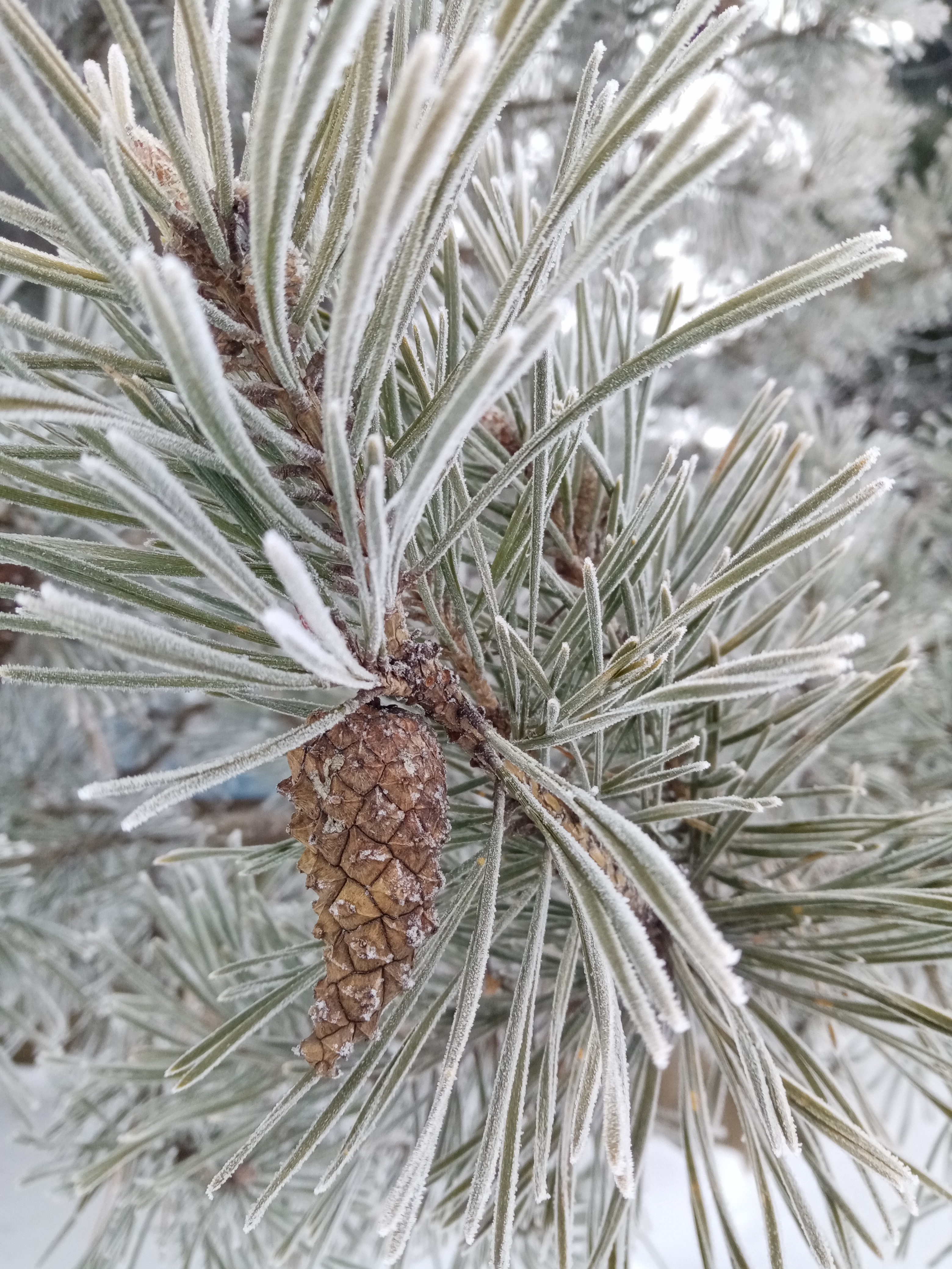 Cono de pino cubierto de nieve