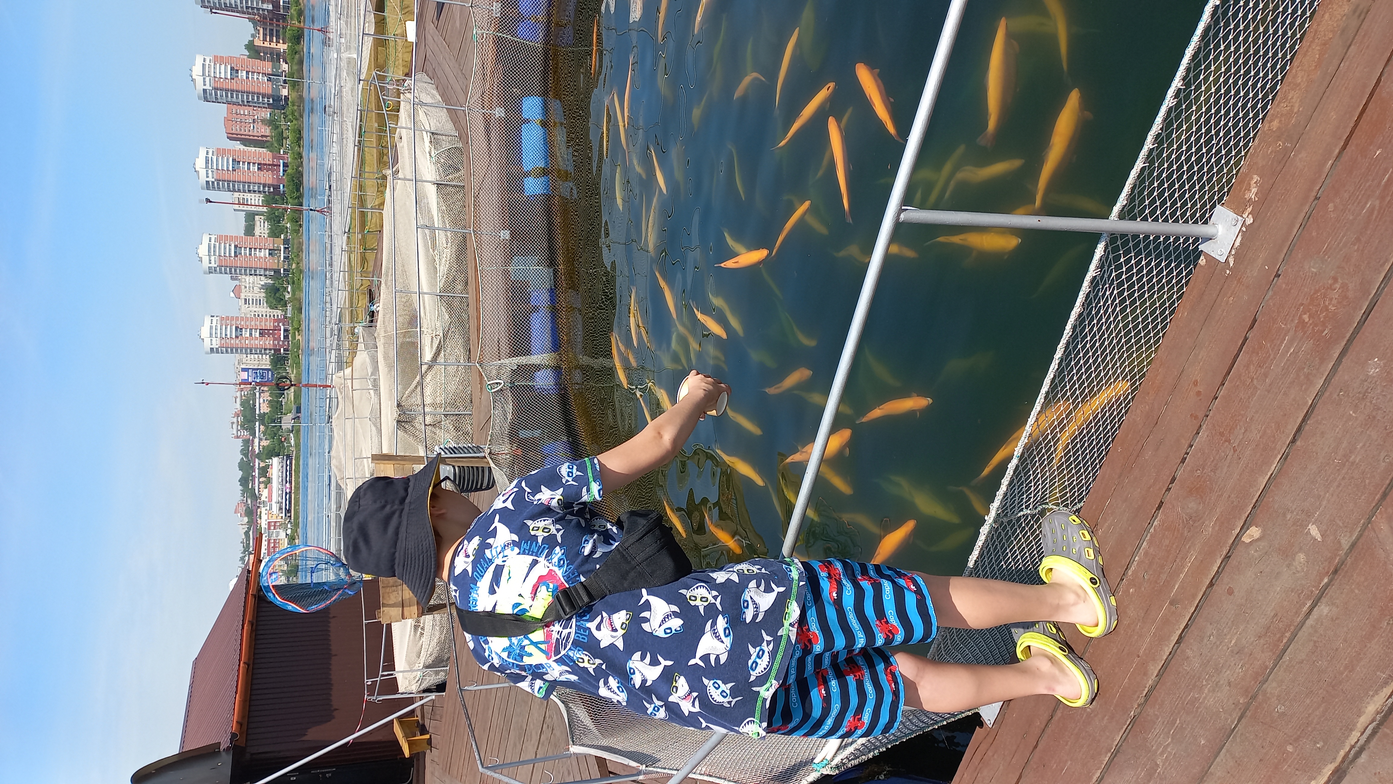 Alimentar a los peces cerca de la casa en el río Angara