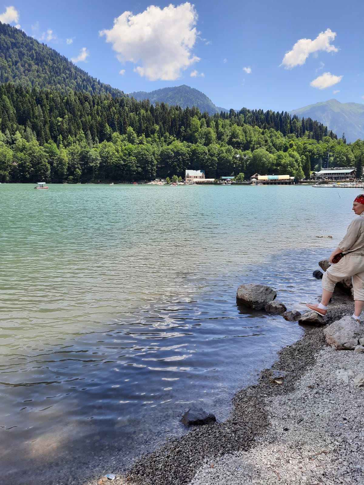 "Lago ritsa: una superficie de espejo en los brazos de las cadenas montañosas"