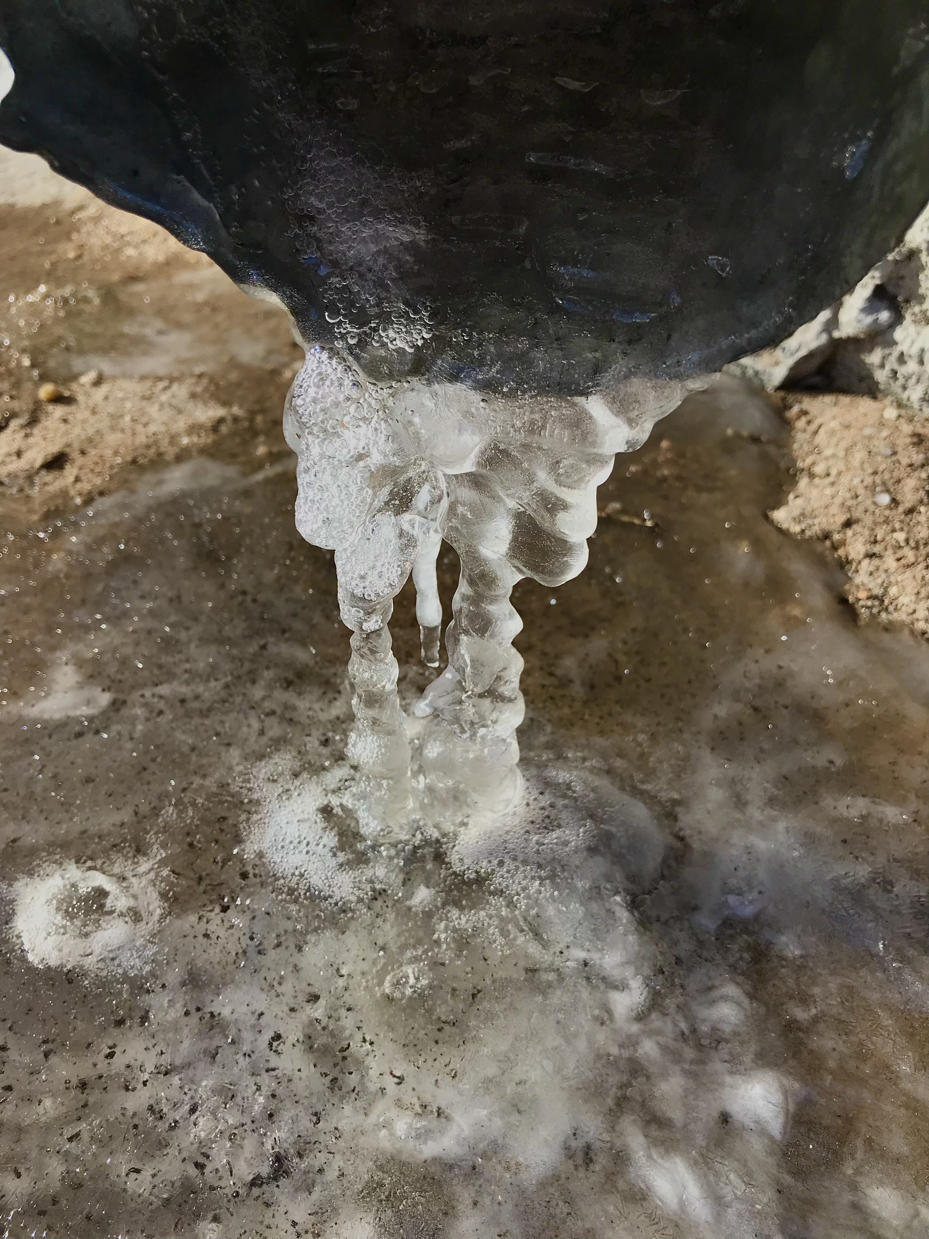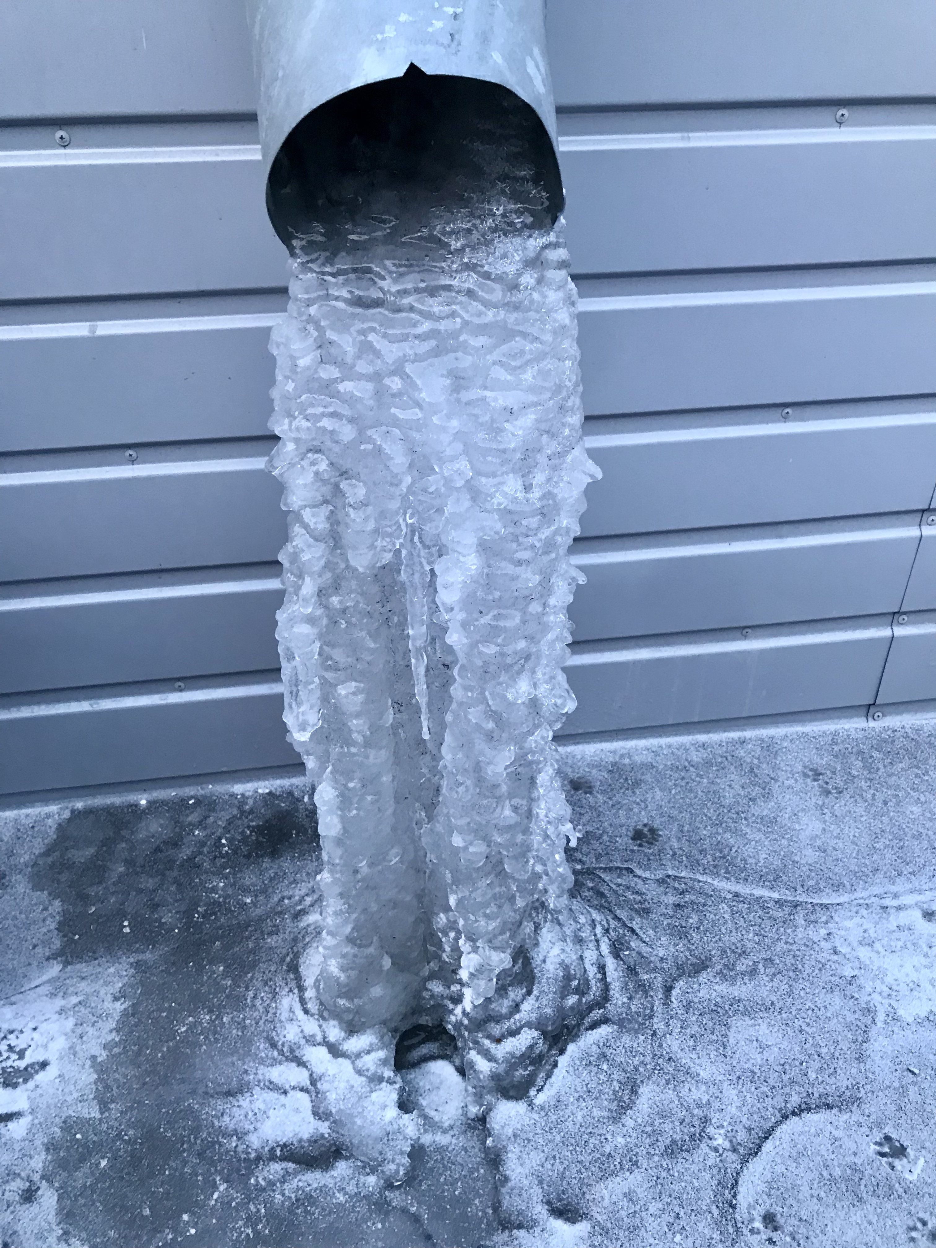 Temprano en la mañana, el hielo, y por la tarde de la tubería se vierte agua.