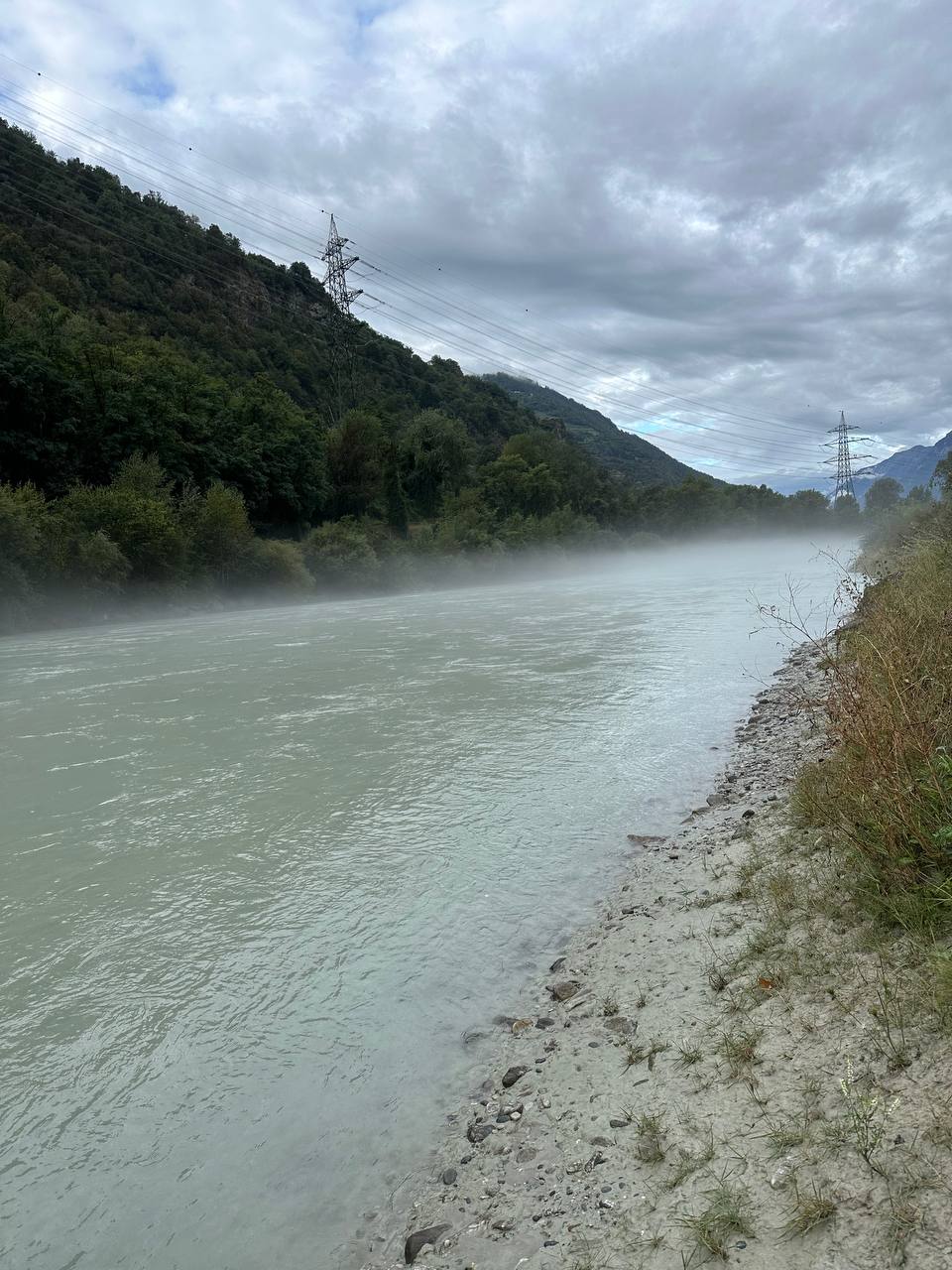 Fuerte niebla en primavera sobre el agua