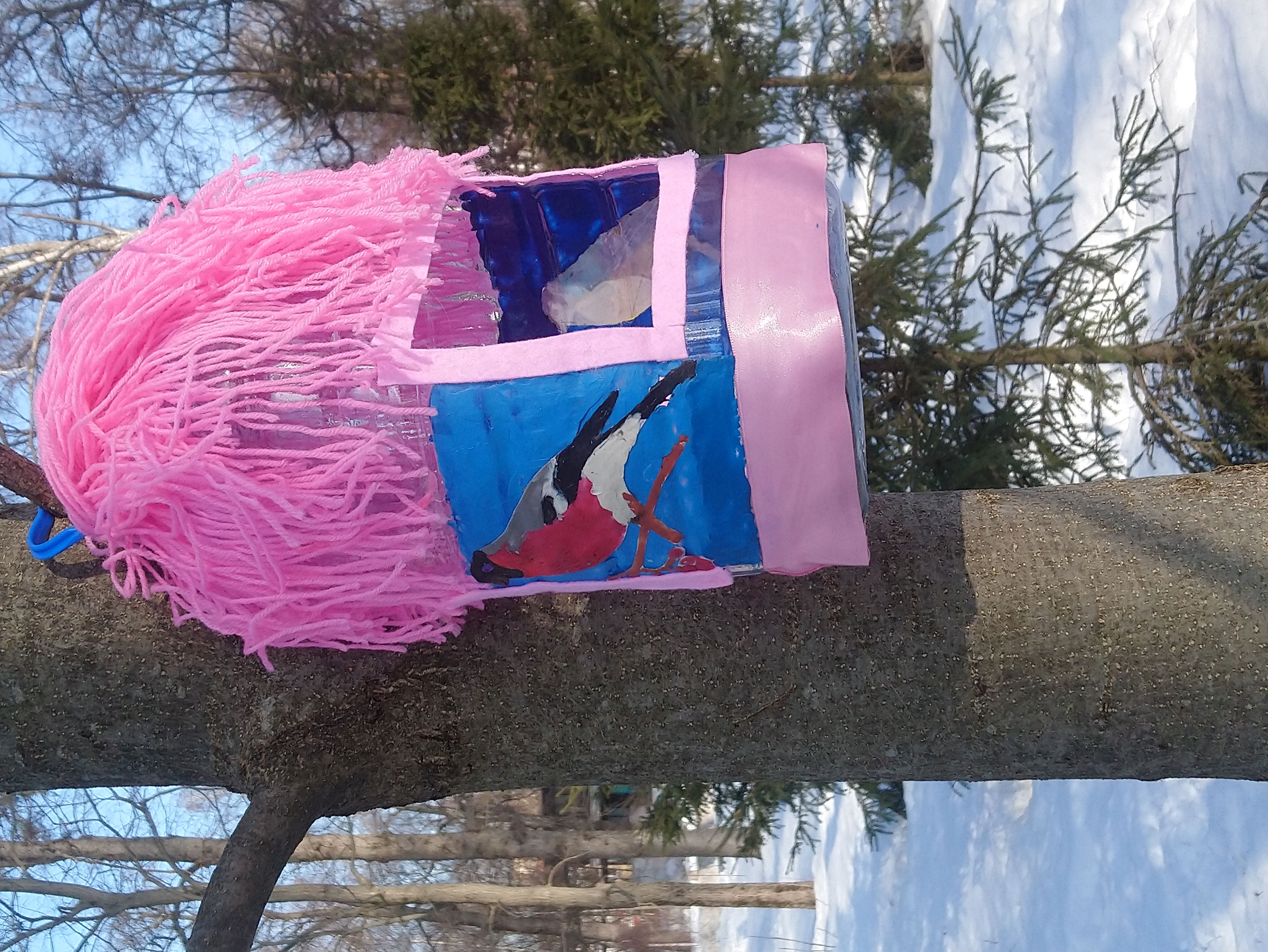 Alimentador de aves de botella de plástico y restos de tela, plastilina.