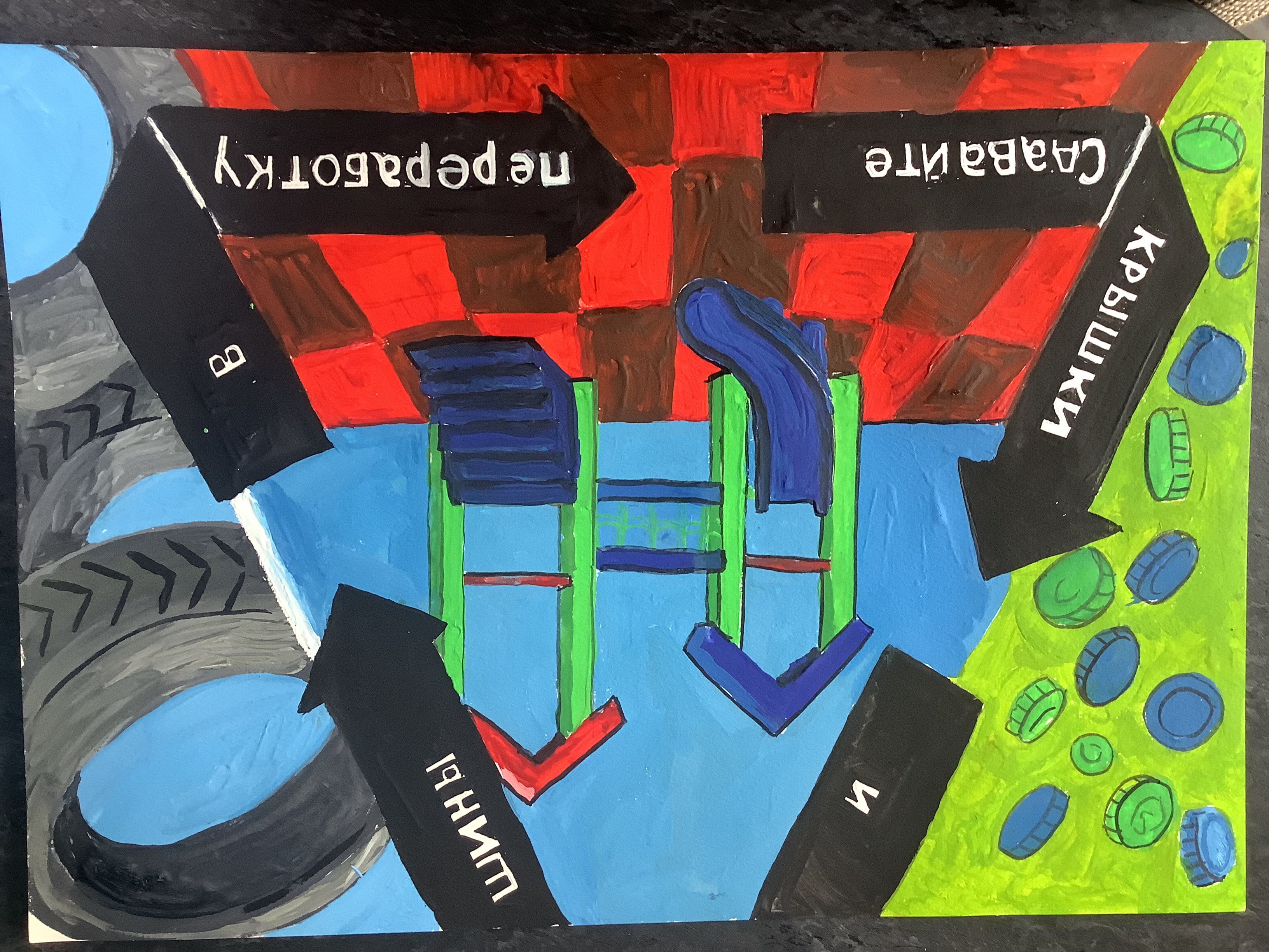 ¡Recicle las tapas y los neumáticos! Cartel informativo.